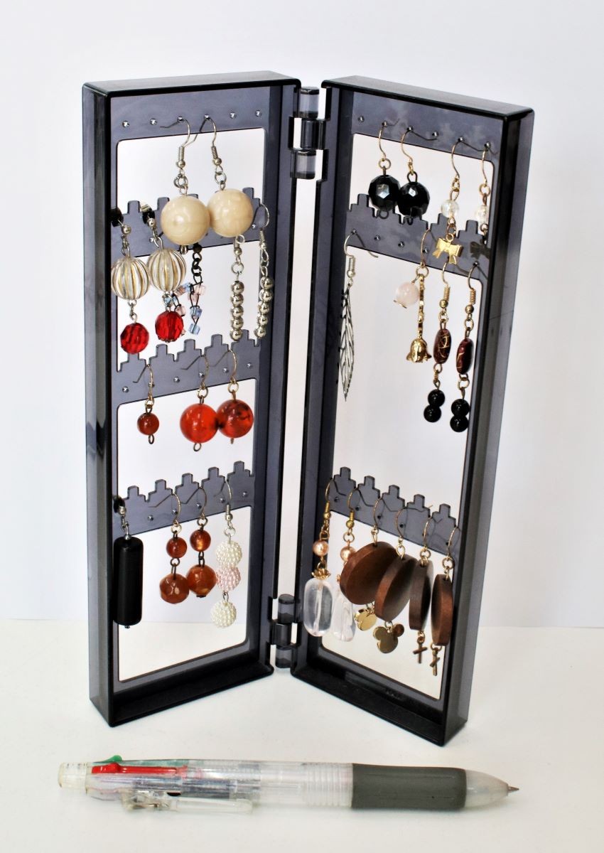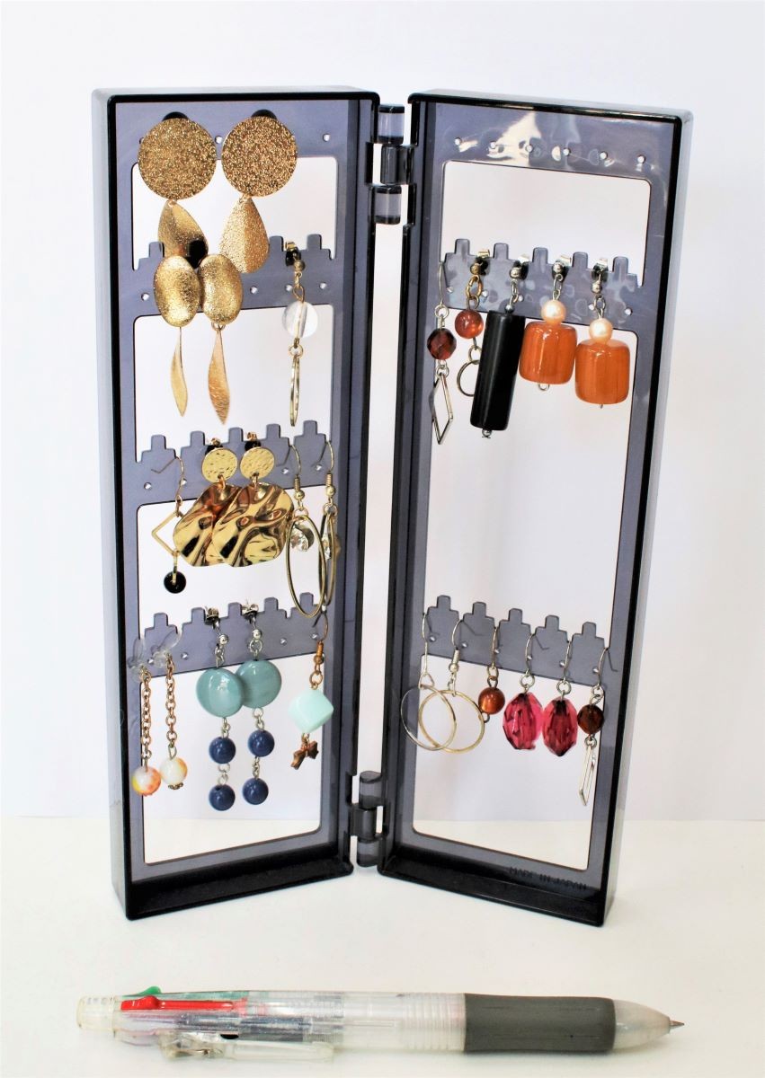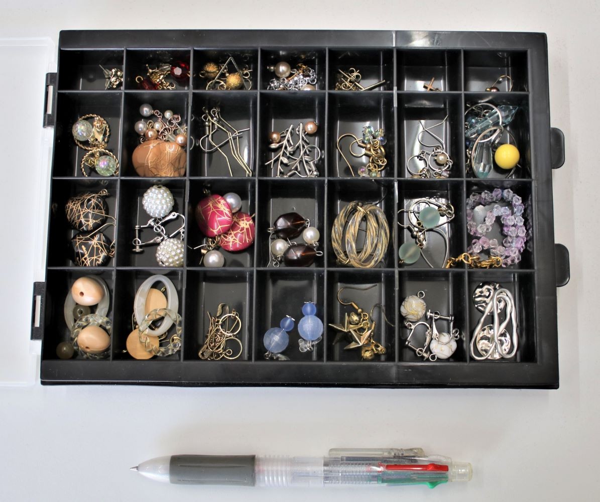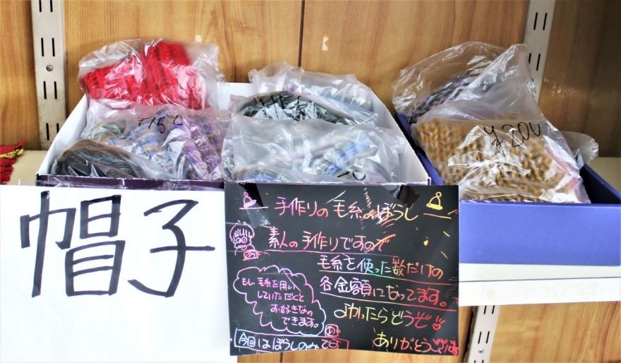 作品の種類と材料、道具 ; 作品は大きく分けてアクセサリーと編み物です。アクセサリーの大半はイアリングとピアスです。編み物は帽子やマフラーです。コロナ感染が始まった頃にマスクが品薄であった一時期には、布マスクも作られていました。イアリングやピアスの材料は、市内の百円ショップならどの店にもアクセサリーコーナーがあり、簡単に手に入るそうです。特殊なパーツは福山の手芸店などに買いに行くこともあるそうです。