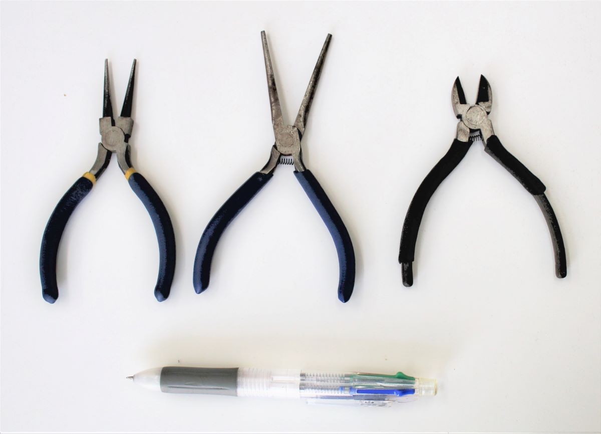 上のような様々なパーツを組み合わせて、一つの作品が出来上がります。金属部分を曲げたり、切断したり、かしめたりするための工具が右のようなものです。