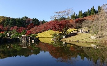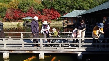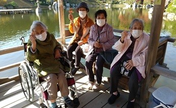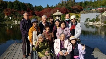 2021年11月19日(金) ミニデイ利用者と体験希望者合わせて7名で 広島空港近くの三景園に紅葉狩りに出かけました。この日は朝から雲一つない絶好のお天気に恵まれ、穏やかで暖かな日差しの中、ゆっくりと園内を巡り、紅葉を満喫しました。