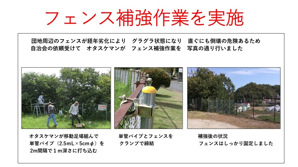 団地周辺にはフェンスが張られていますが、傷みが目立つため、自治会からの要請を受けて、補強工事を行いました。今回は下公園を中心に、オタスケマンが考案し実績のある作業方法で、手際よく工事を終えました。