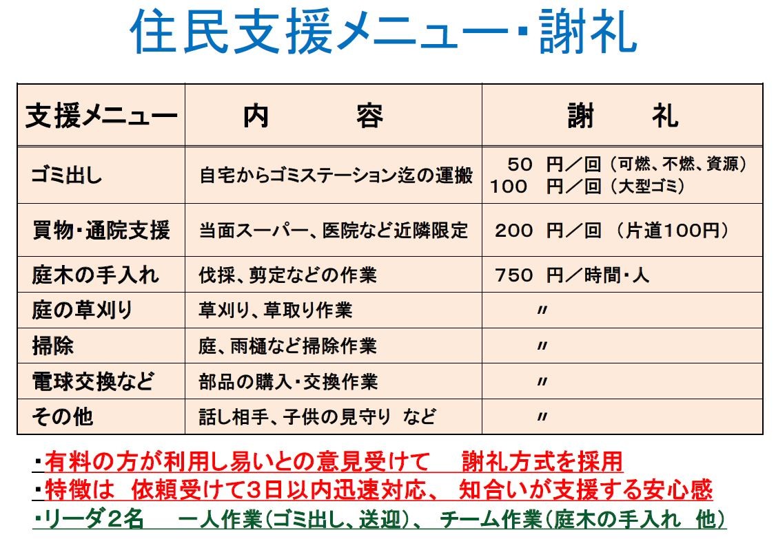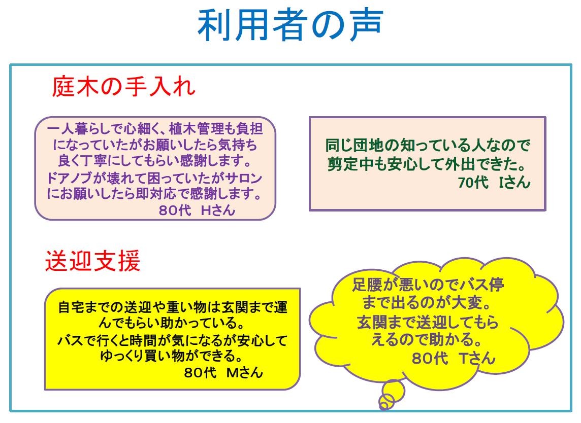 送迎・家事手伝い・草刈り・お話相手など